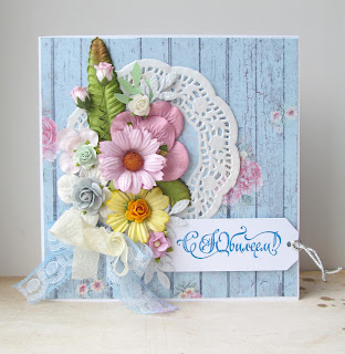 И моя открыточка по ней. Фон - мои любимые деревяшки и бумажка с тиснением, много цветочков, вырубные салфеточки и веточки и малюсенькие пуговки, купленные когда-то очень давно. Я их постоянно теряю))) Сложу куда-нибудь и потом долго найти не могу. Ещё бы, 5мм всего)
