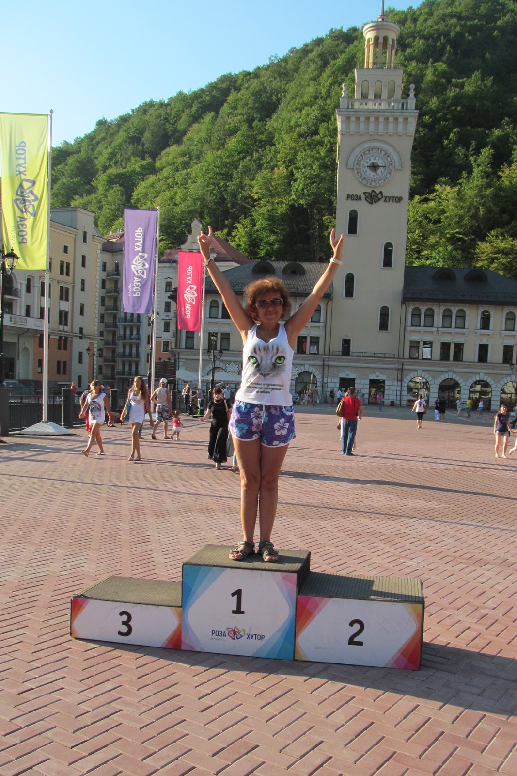 Центральная площадь Роза Хутор и Ратуша с часами. Здесь награждали победителей. Я тоже чуток постояла на пьедестале)))