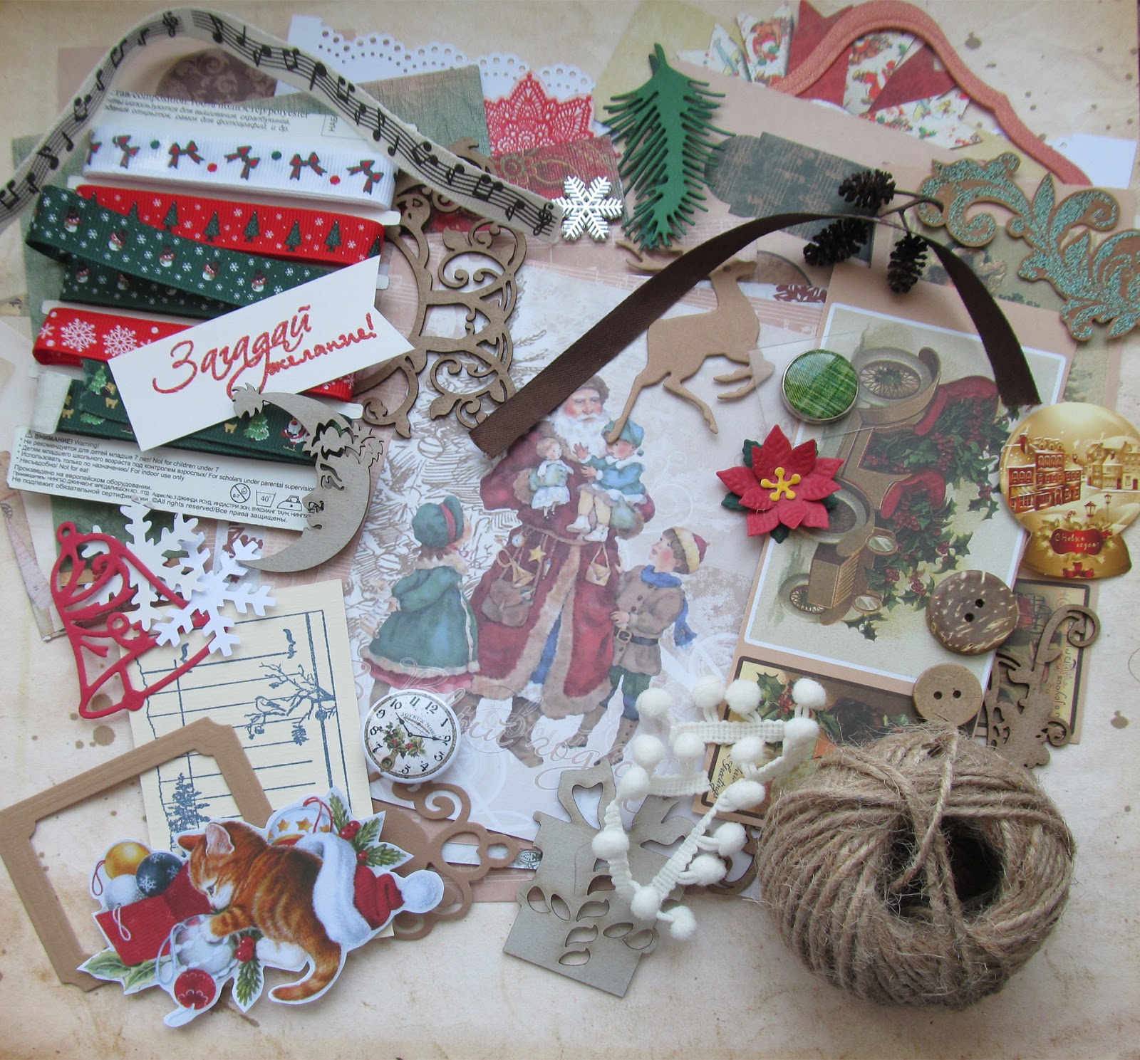 Насобирала кучку всего. Уже когда добавила фотку, заметила, что почти вся бумага спряталась под украшалками. Но чуток всё равно видно. Жду второй этап, а между делом наверное буду собирать добавочные странички. Которые сверх нормы)