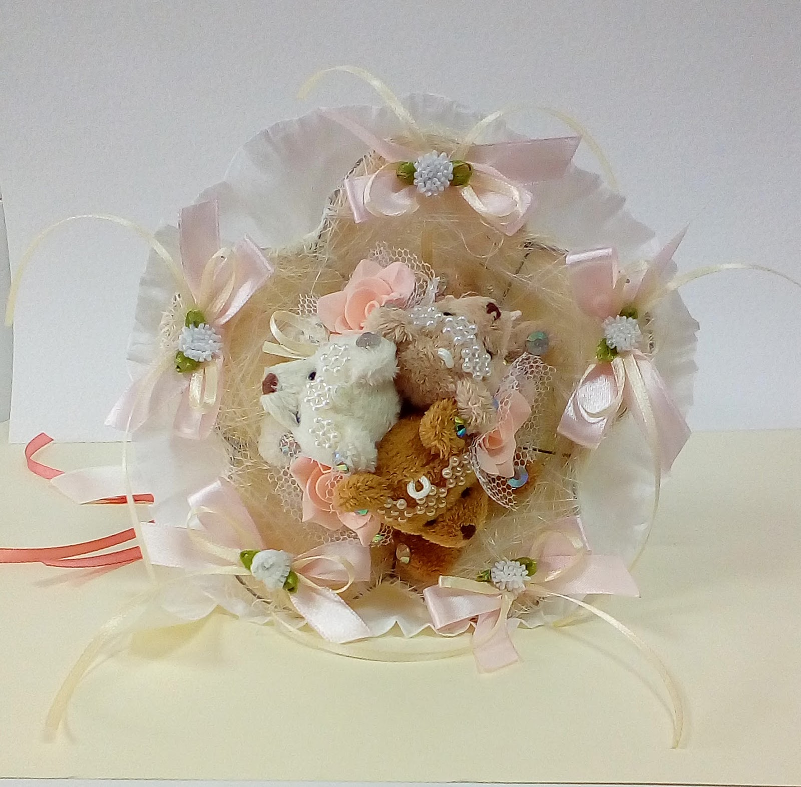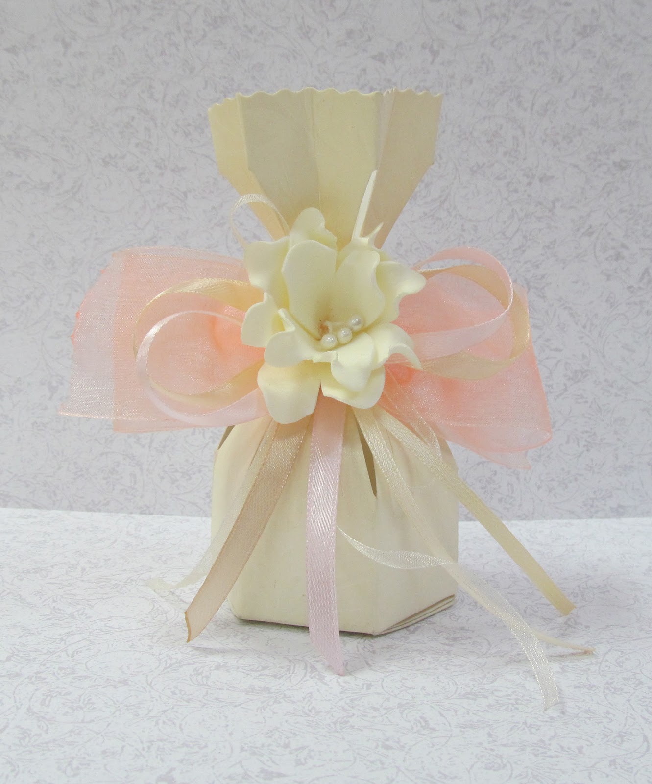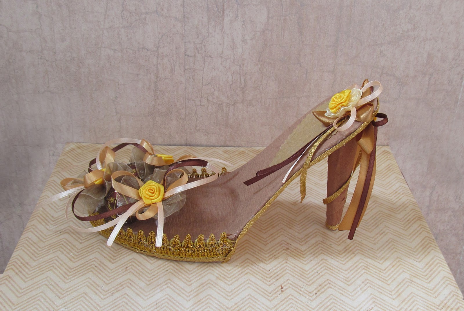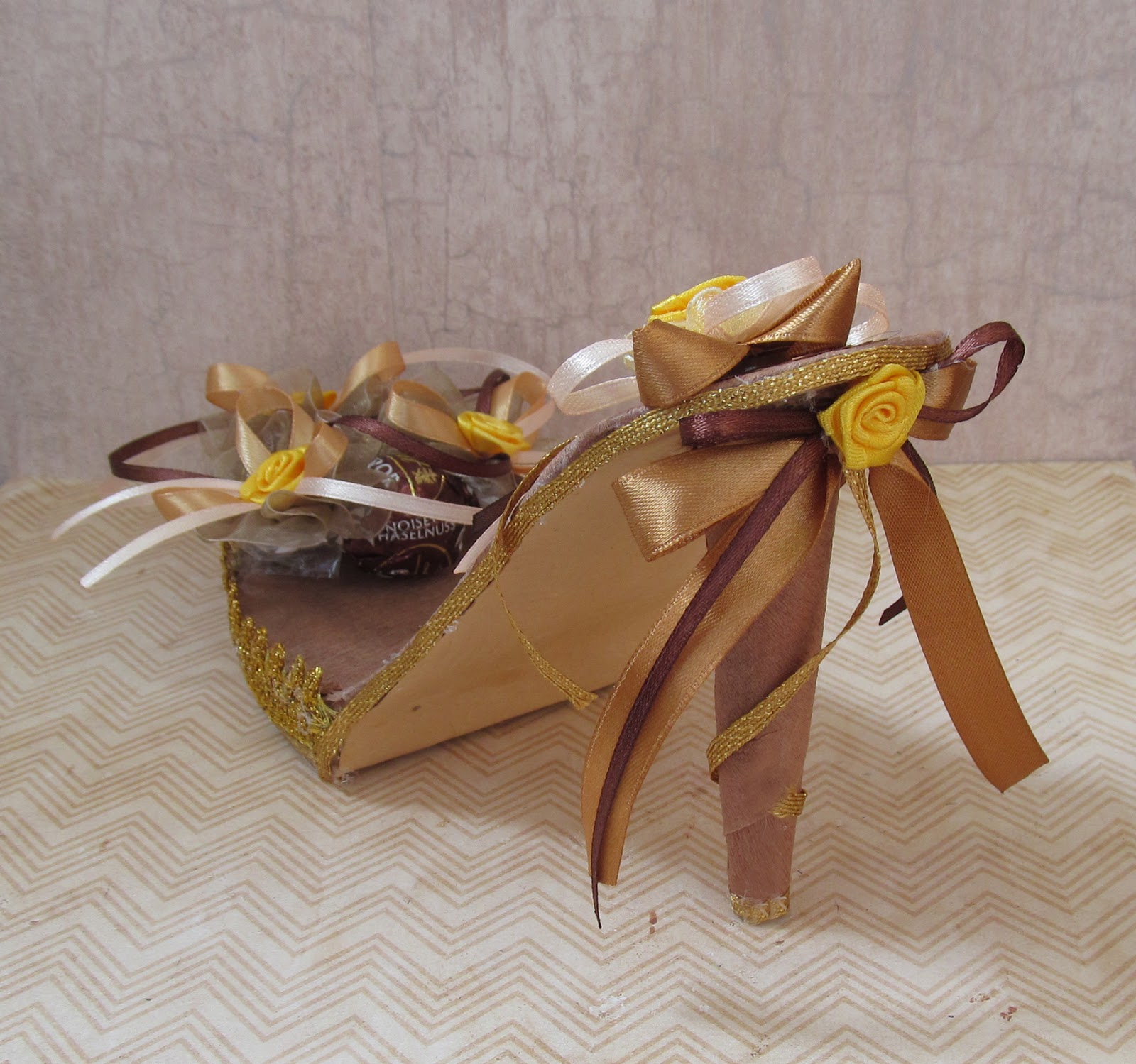 Украшения только из лент, ничего бумажного. Конфеты на туфельку не приклеивала. приклеены только цветочки к фантикам. Но они легко отклеиваются. Конфеты съели - подарок остался)))